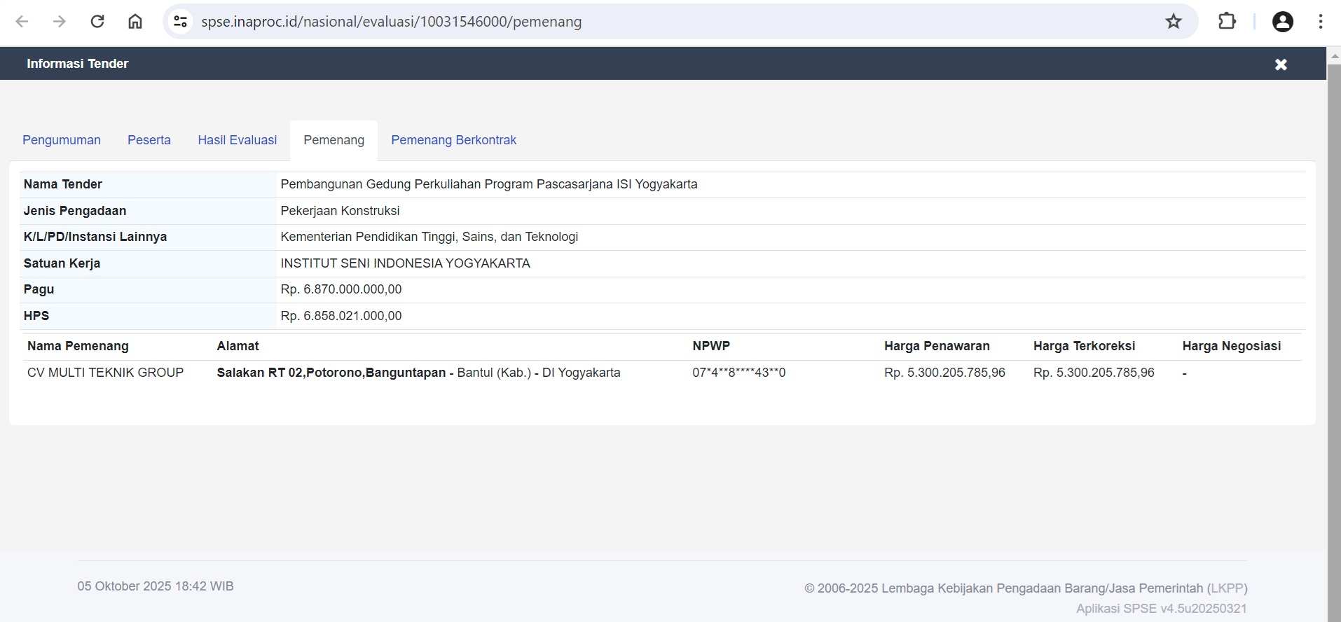 | 2. Ringkasan Kontrak yang sekurang-kurangnya mencantumkan informasi mengenai para pihak yang bertandatangan, nama direktur dan pemilik usaha, alamat penyedia, nomor pokok wajib pajak, nilai kontrak, rincian pekerjaan, spesifikasi pekerjaan, lokasi pekerjaan, waktu pekerjaan, sumber dana, jenis kontrak, serta ringkasan perubahan kontrak | Lihat | – | |